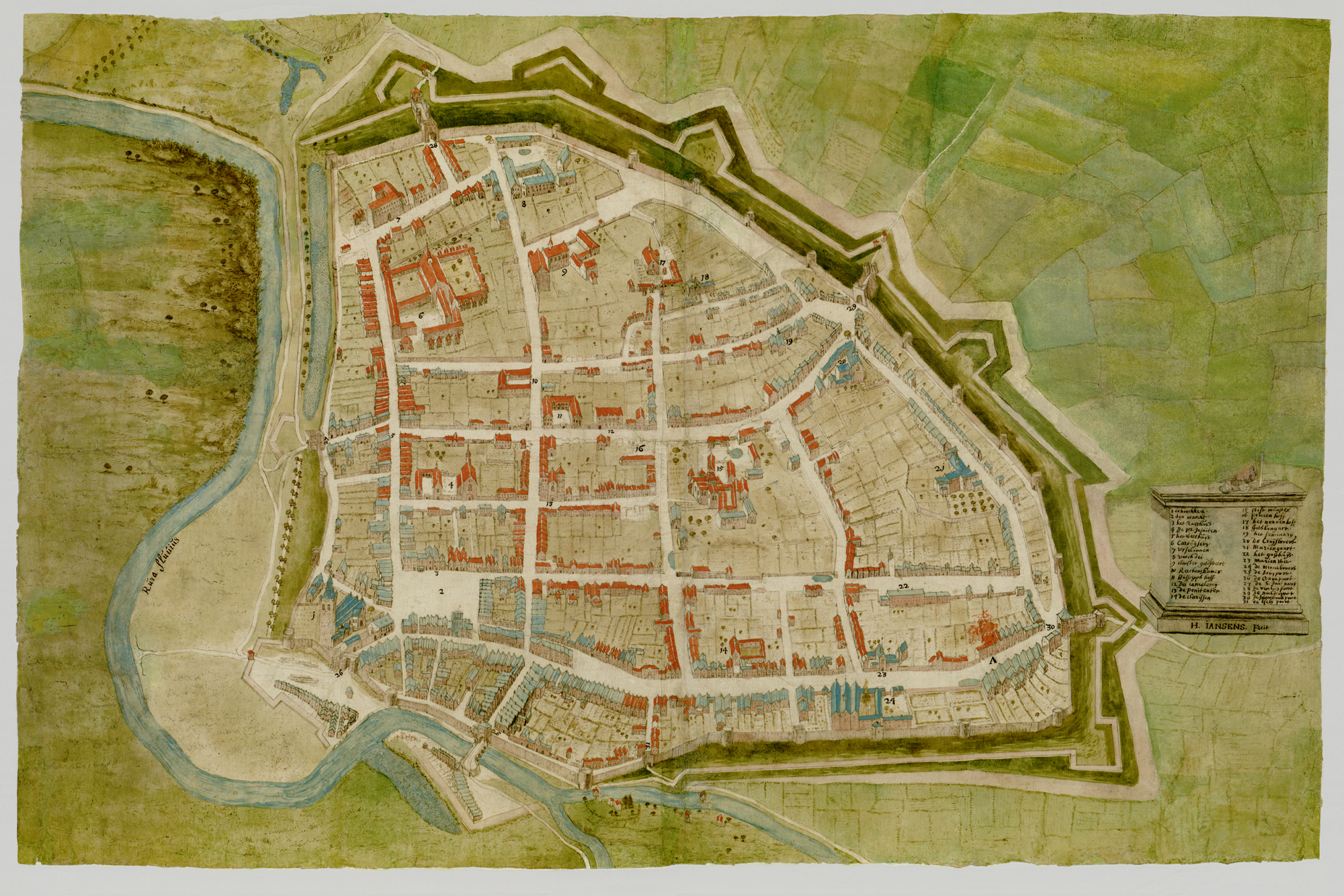 © Gemeente Archief Roermond. Ingekleurde pentekening: de panden met blauwe daken bleven bij de stadsbrand van 31 mei 1665 gespaard, de panden met rode daken zijn na de brand weer opgebouwd.